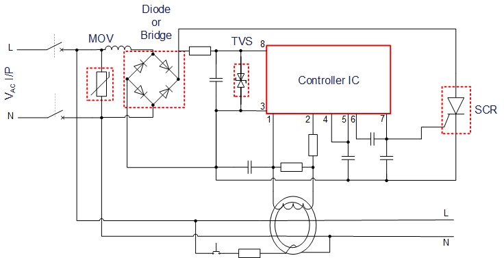 漏電保護(hù)器,簡稱漏電開關(guān),又叫漏電斷路器,主要是用來在設(shè)備發(fā)生漏電故障時以及對有致命危險的人身觸電保護(hù),具有過載和短路保護(hù)功能,可用來保護(hù)線路或負(fù)載的過載和短路,亦可在正常情況下作為線路的不頻繁轉(zhuǎn)換啟動之用。 目前市場上使用的漏電保護(hù)裝置種類繁多,但大體的原理都相差不大。漏電保護(hù)器主要是由三部分組成:檢測元件、中間放大環(huán)節(jié)、操作執(zhí)行機(jī)構(gòu) 1. 檢測元件:由電流互感器組成,檢測漏電電流并發(fā)出信號 2. 放大環(huán)節(jié):將微弱的漏電信號放大,按裝置不同可采用機(jī)械式或電子式 3. 執(zhí)行機(jī)構(gòu):收到信號可控硅由斷開狀態(tài)變?yōu)閷?dǎo)通狀態(tài),主線圈通電后,主開關(guān)由閉合狀態(tài)轉(zhuǎn)換為斷開狀態(tài),從而切斷電源 應(yīng)用于漏電保護(hù)器領(lǐng)域,捷捷微電 能提供比較齊全的元件解決方案。比如:AC 輸入端防浪涌的壓敏電阻(MOV)、對交流進(jìn)行整流的高壓整流二極管 (Diode) 或者是整流橋(Bridge)、對電源端進(jìn)行過壓防護(hù)的瞬態(tài)抑制二極管(TVS)、整個電路的控制核心集成電路(IC)、電路動作執(zhí)行機(jī)構(gòu)(SCR)等。